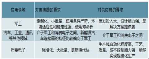 連接器作為一種基礎的電子元器件,下游應用非常廣泛,主要的應用領域包括汽車、通訊、計算機、工業設備、軌交、軍工等,而不同的應用領域對連接器及其供應商的要求有所不同。比如軍用連接器需要適應各種嚴苛的使用環境,對穩定性要求高,一般為定制化、小批量產品,供應商的研發投入大,需要具有較強的設計能力,為客戶提供整體解決方案;而消費電子產品中的連接器標準化程度高,生產量大,由于更新換代快,因此對產品穩定性和壽命的要求相對較低,供應商生產的自動化程度高,工藝、質量、成本的控制水平是核心競爭力;其他的應用領域,如汽車、工業、通訊等,對連接器的要求介于軍工和消費電子之間,其中新能源汽車所使用的高壓連接器多為定制化產品,對穩定性、壽命的要求與軍工領域接近。