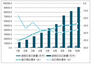 2019年1-10月中國鹵鎢燈累計進出口數量及增速趨勢圖