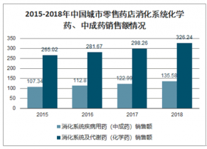 2015-2018年中國城市零售藥店消化系統(tǒng)化學藥、中成藥銷售額情況