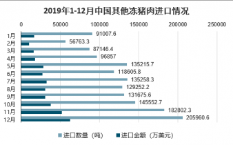 2019年1-12月中國其他凍豬肉進口數量為1516097.5噸,進口金額為362207.4萬美元;2019年1-12月中國其他凍豬肉出口數量為18115.5噸,出口金額為9367.9萬美元。