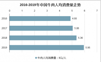 我國牛肉人均消費量也呈現逐漸上升,人均消費量從2016年的4.88KG上升到2019年的5.95KG。