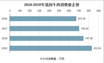 隨著國內經濟發展、人口總量增加、居民收入提高,我國牛肉消費呈穩步增長態勢。數據顯示:2019年我國牛肉消費量為832.93萬噸,同比增長11.36%。