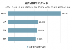 近年來,在消費升級趨勢下,汽車代步屬性逐步弱化。消費者最終準備購買汽車時,汽車的舒適性成為消費者購買時關注的第一屬性,而汽車的口碑、促銷和油耗等關注度僅有20%左右。