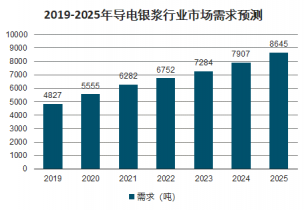 2019年中國導電銀漿行業市場需求達到4827噸,預計到2020年導電銀漿行業市場需求量將達到5555噸,2025年需求量達到8645噸。