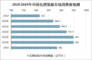 2014年中國瓦楞紙板市場消耗量791億平方,2019年瓦楞紙板市場消耗量達到814億平方米,復合年增長率為0.6%,預計2020年瓦楞紙板市場消耗量增至868.5億平方米,2024年將達到949億平方米。
