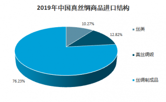 近年來,中國正逐步由生絲、坯綢原料的最大出口國,向絲綢終端商品生產和出口國轉變。2019年中國真絲綢商品出口結構中,絲綢制成品占比54%,為出口額占比最高的絲綢商品。