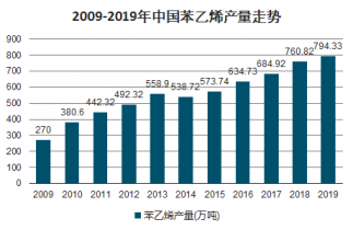 2009-2019年中國苯乙烯產量走勢