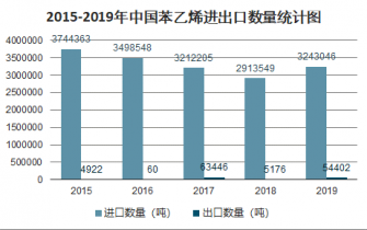 2015-2019年中國苯乙烯進出口數量統計圖
