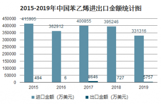 2015-2019年中國苯乙烯進出口金額統計圖