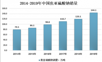 2014年我國焦亞硫酸鈉產量為88.5萬噸,2019年我國焦亞硫酸鈉產量增長至162.2萬噸,2014年以來我國焦亞硫酸鈉產量復合增長率為10.62%; 2014年我國焦亞硫酸鈉需求量為79.5萬噸,2019年我國焦亞硫酸鈉需求量增長至144.1萬噸,2014年以來我國焦亞硫酸鈉需求量復合增長率為10.42%。