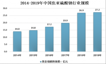 2014年我國焦亞硫酸鈉市場規模為13.98億元,2019年我國焦亞硫酸鈉市場規模增長至27.24億元,2014年以來我國焦亞硫酸鈉市場規模復合增長率為11.76%。