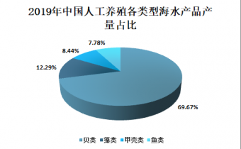 貝類是人工養殖海水產品中最主要的種類,產量占海水產品產量69.67%;其次為藻類,產量占比12.29%。甲殼類和魚類產量分別占比8.44%、7.78%。