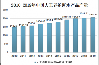 與天然生產海水產品產量下降趨勢不同的是人工養殖海水產品卻逐年上升,2019年中國人工養殖海水產品產量為2065.33萬噸,較2018年增加了34.11萬噸。預計未來人工養殖海水產品產量將繼續呈上升的趨勢。