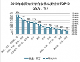 2019年中國淘寶平臺家紡品類銷量TOP10(百萬、%)